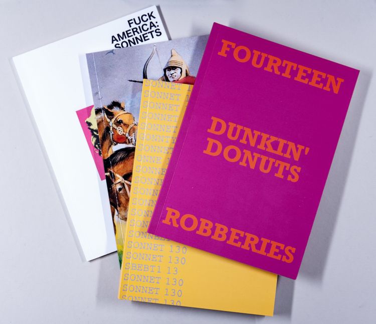 Fast Food Robberies is a fourteen-piece subseries situated within Staniforth’s long-term project Anti-Sonnets and can be conceived as a sonnet in itself, in which each of the fourteen publications forms a verse, so to speak. Since each publication in turn contains fourteen sonnets, the subseries can also be described as a sonnet cycle. This illustrates the shift in scale: from lines of poetry to collections of texts, from a single volume to a series, which forms the conceptual basis of this publishing project.