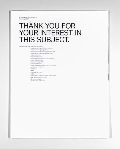 The April 28 purge redirected hundreds of climate change URLs to one of three new pages: ‘This page is being updated,’ ‘Complying with President Trump’s Executive Order on Energy Independence,’ or the scrubbed ‘Energy Resources for State, Local, and Tribal Governments.’ But many document files (PDFs, PPTs, mp3s, docs) survived the purge and continued to live online, remaining hidden from public view without their corresponding links—until now. Steve, Harvey and Matt, broadcasts the entire collection of climate change URLs ten times each day—a randomized mix of restored access and empty gestures. The 734-page printed book contains EPA emails and spreadsheets that detail the purge, obtained by Freedom of Information Act requests” (Paul Soulellis, “Readme” on Github).