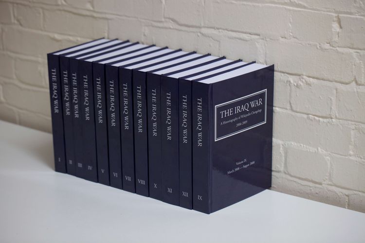 James Bridle’s twelve-volume set The Iraq War: A Historiography of Wikipedia Changelogs documents in nearly 7,000 pages all 12,000 changes made to the Wikipedia article on the Iraq War in five years between December 2004 and November 2009.